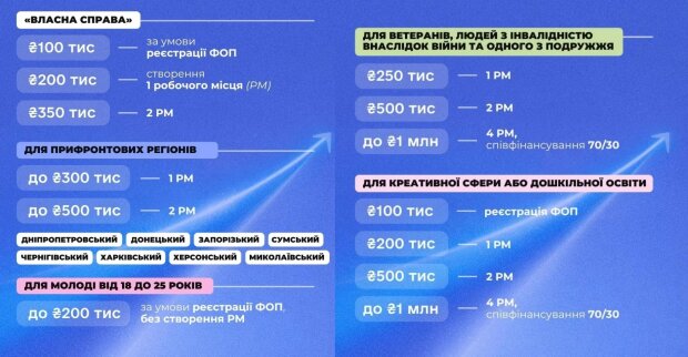 У межах програми «Власна справа» у 2026 році збільшено базові розміри мікрогрантів — до 100 тис. грн без створення робочих місць, до 200 тис. грн за умови створення одного робочого місця та до 350 тис. грн за умови створення двох робочих місць.