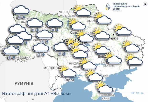 У західних областях, а також у Житомирській і Вінницькій областях уночі прогнозують невеликий сніг. Удень опади зміняться — сніг переходитиме в дощ або мокрий сніг.
