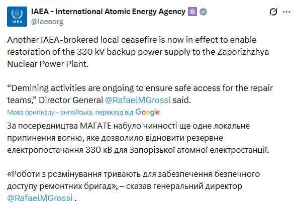 Поблизу ЗАЕС встановили локальне перемир’я для ремонту ліній електромереж і запобігання ядерній аварії. Оголошено припинення вогню в районі ЗАЕС, — МАГАТЕ. Деталі про це в матеріалі Стіна.