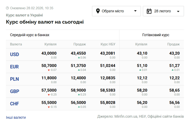 Курс валют в Україні станом на 28 лютого 2026 року