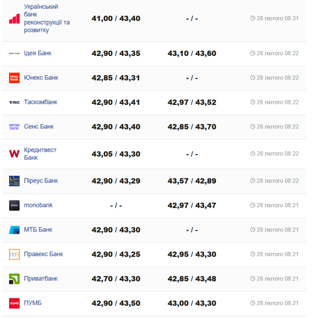 На сьогодні, 28 лютого, курс валют в Україні такий: