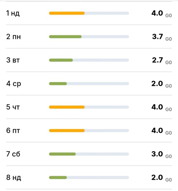 Проте, в денні та вечірні години інтенсивність коливань зменшиться, а Кр-індекс не перевищуватиме 2,67- 3 балів (зелений рівень).