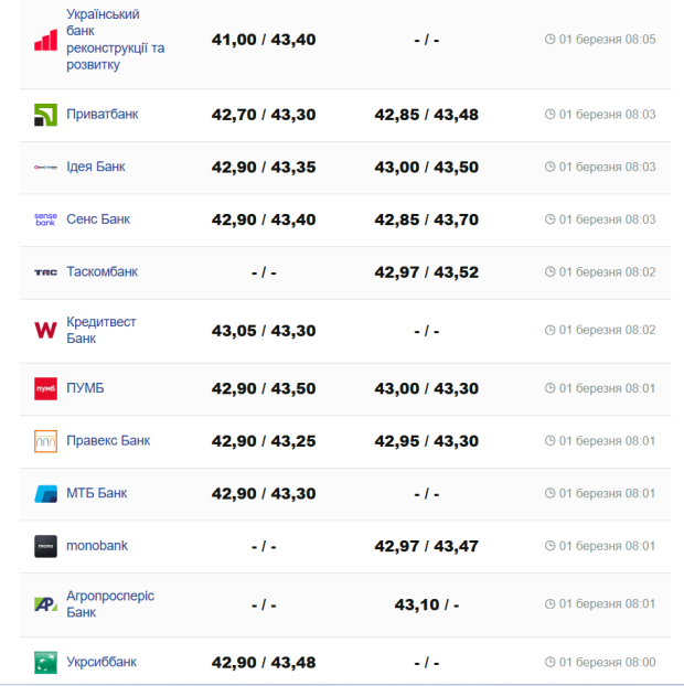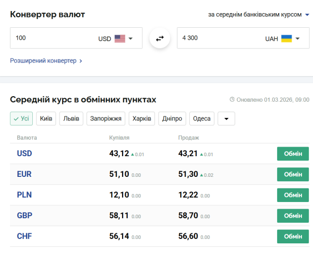 На сьогодні, 1 березня, курс валют в Україні такий: