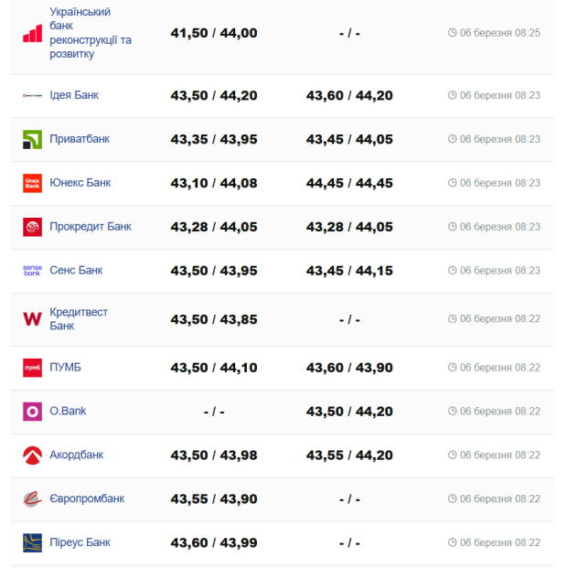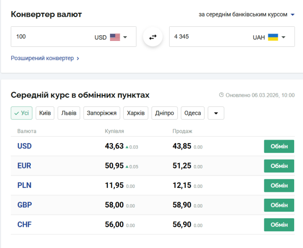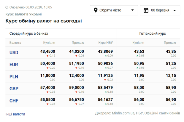 На сьогодні, 6 березня, курс валют в Україні такий: