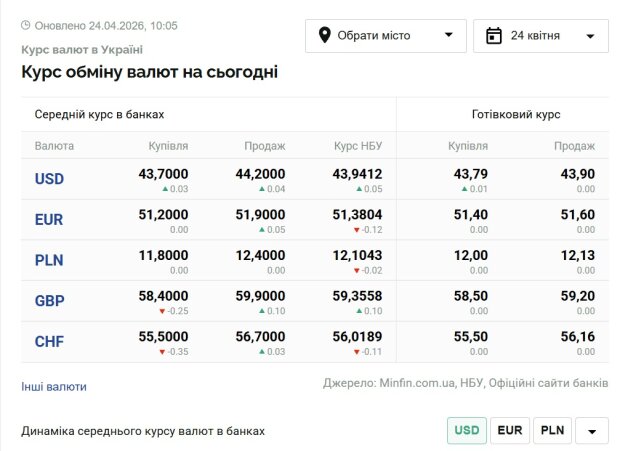 Станом на 24 квітня 2026 року офіційний курс долара США становить 43,94 грн, а євро — 51,38 грн.
