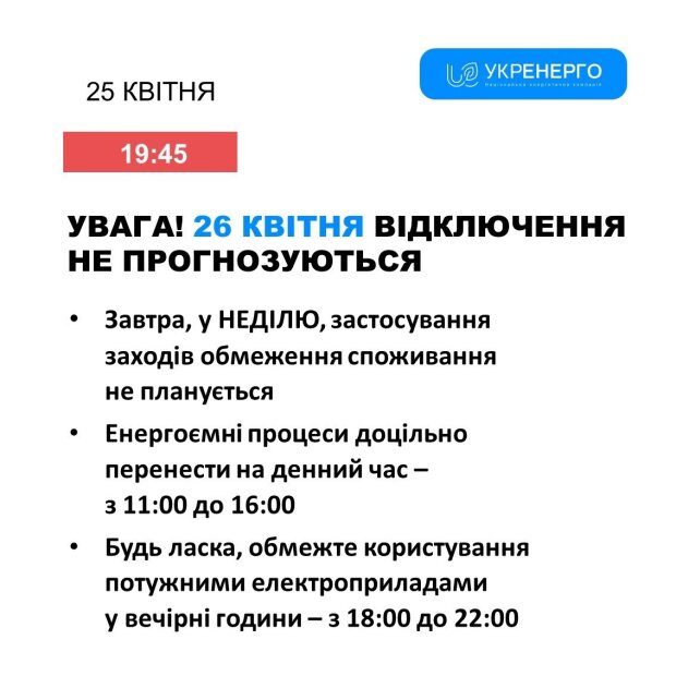 На неділю, 26 квітня, застосування обмежень споживання електроенергії не планується. Це означає, що графіки відключень наразі не вводяться, а побутові споживачі можуть розраховувати на стабільне електропостачання.