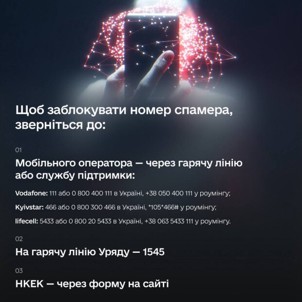 Другий варіант — звернення на урядову гарячу лінію за номером 1545. Там також приймають скарги на спам і передають їх далі для реагування.