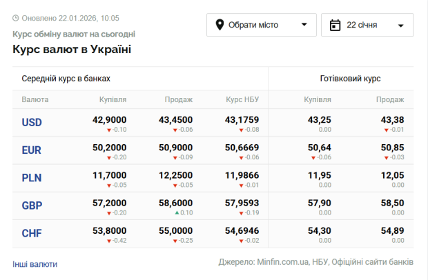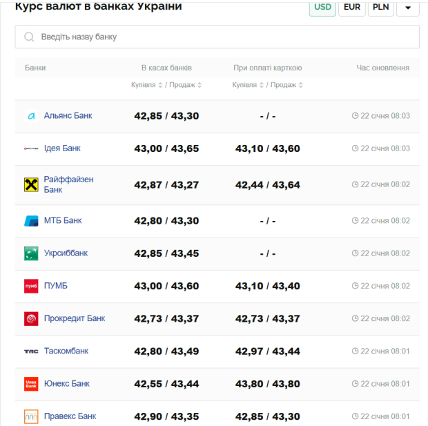 На сегодняшний день, 22 января, курс валют в Украине такой:
