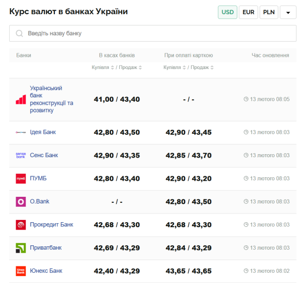 На сегодняшний день, 13 февраля, курс валют в Украине такой: