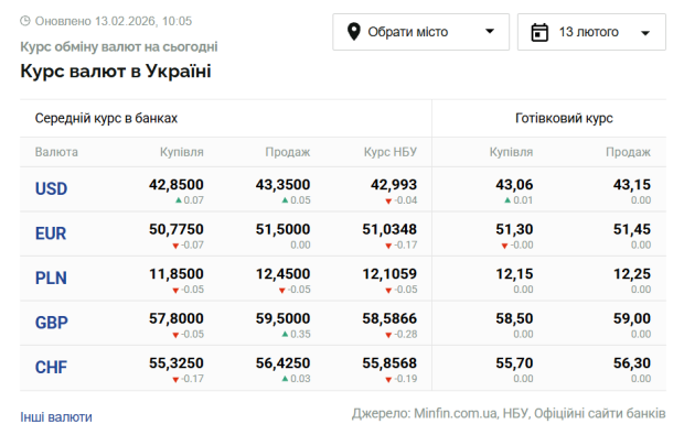 Курс валют по Украине по состоянию на 13 февраля 2026 года