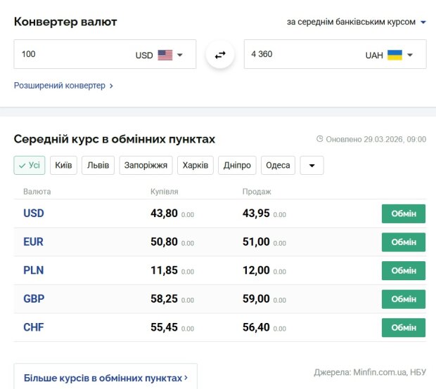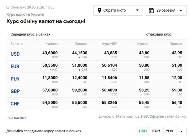 По состоянию на воскресенье, 29 марта 2026 г., курс валют в Украине остается на уровне показателей, установленных на выходные. Поскольку сегодня воскресенье, официальный курс НБУ не менялся с пятницы, а банковский и наличный рынки работают в режиме выходного дня.