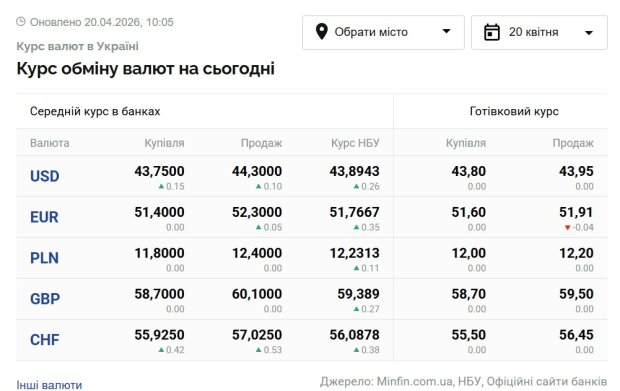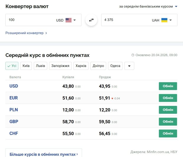 Курс валют в Украине на 20 апреля 2026 года